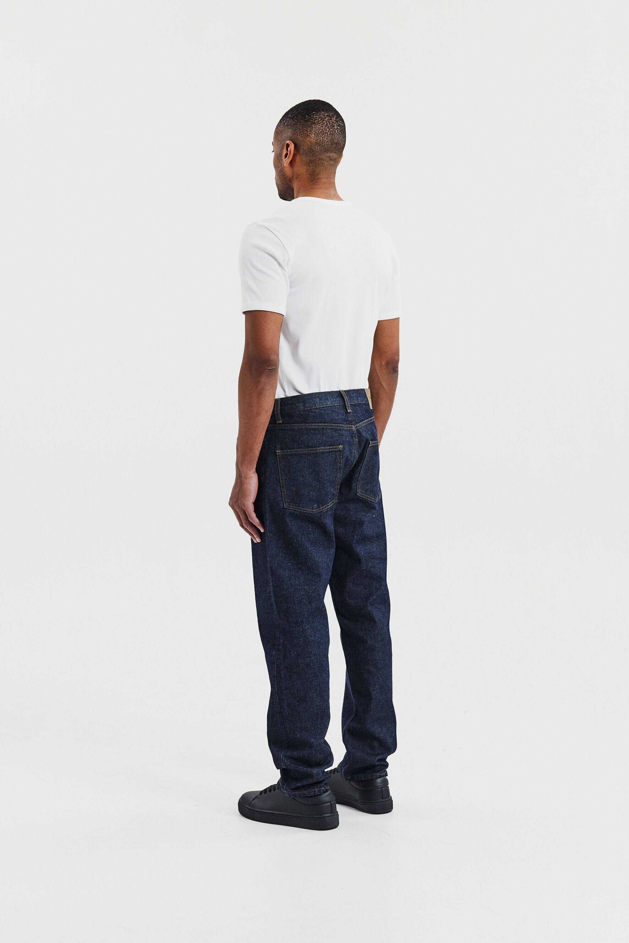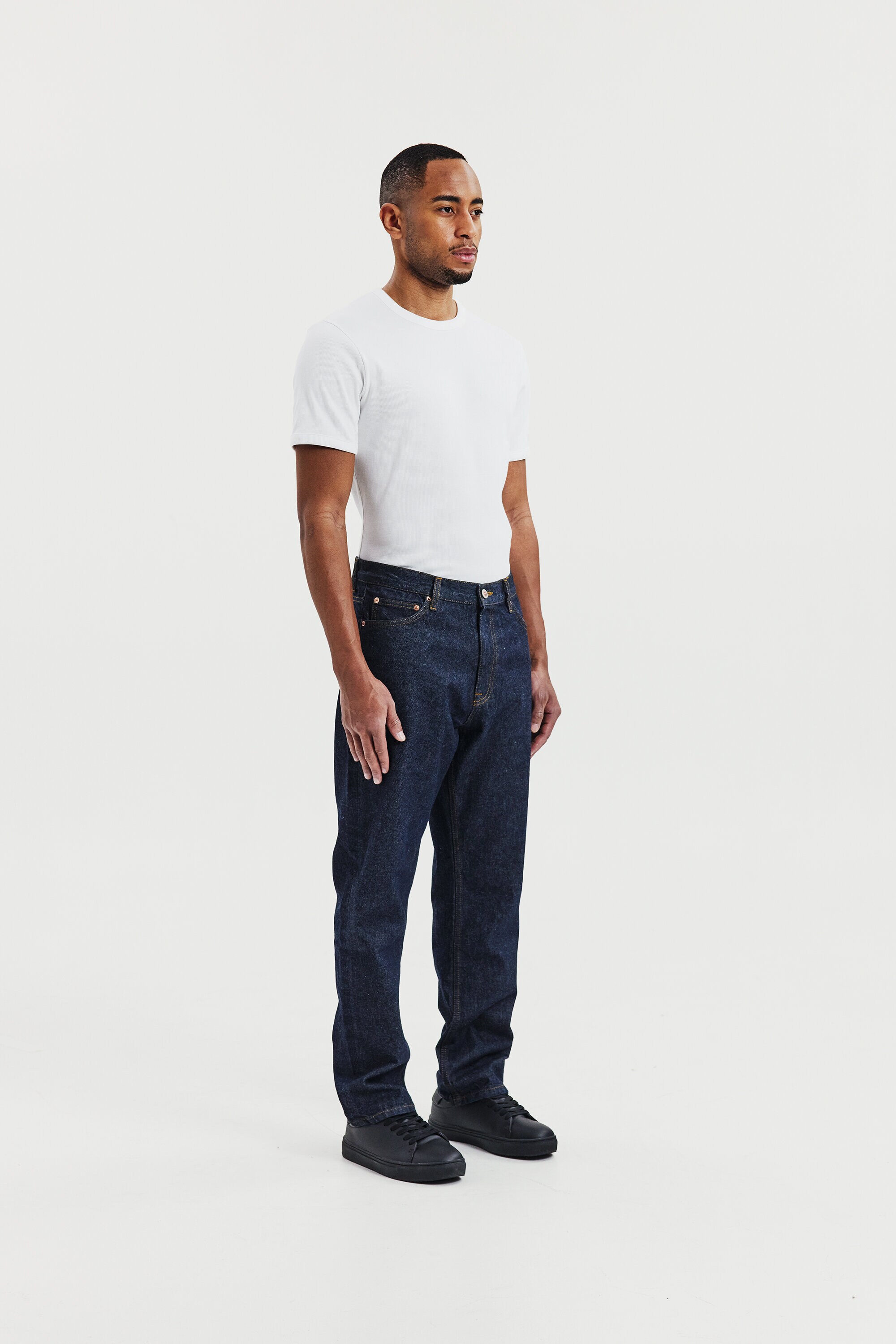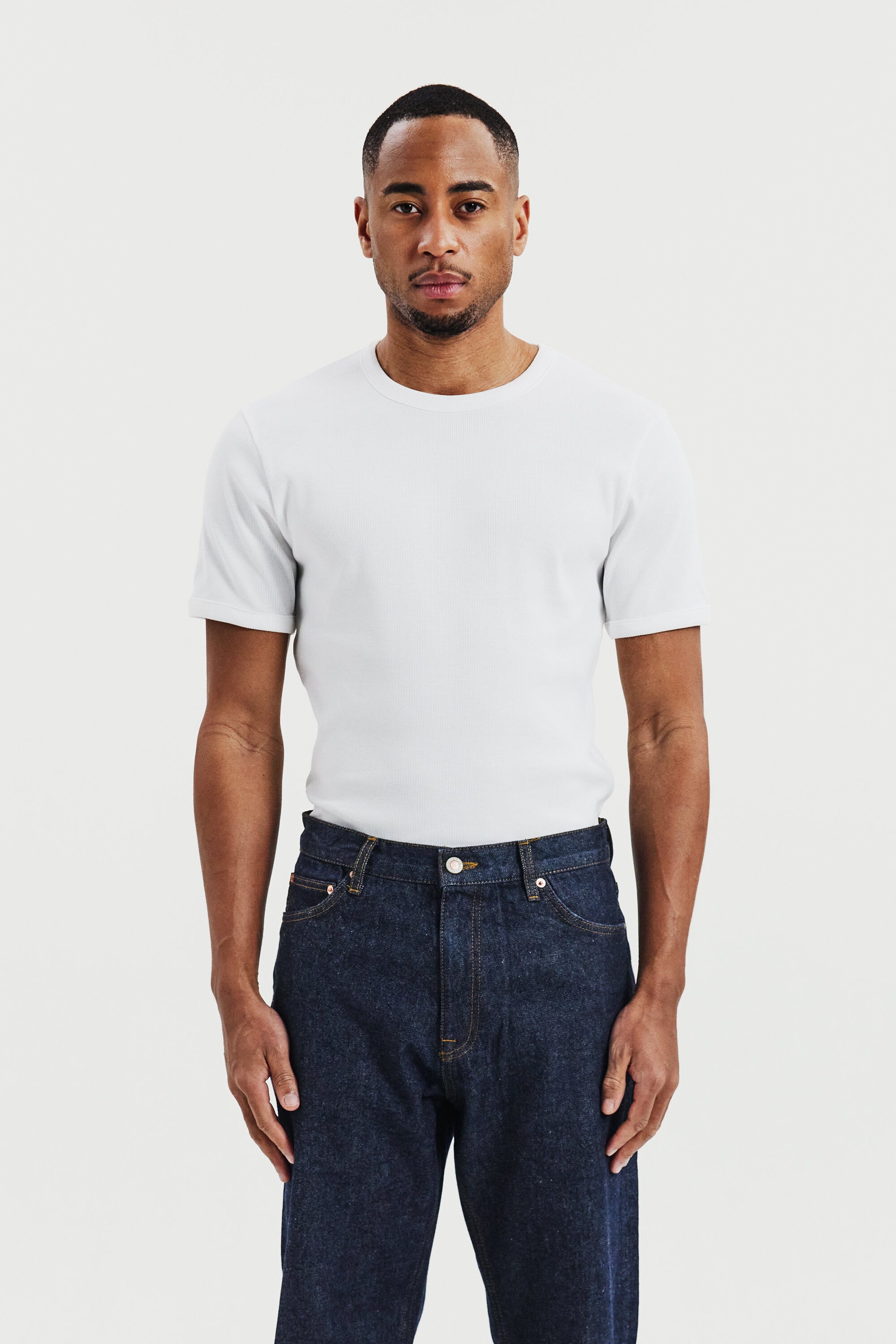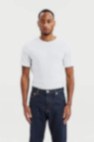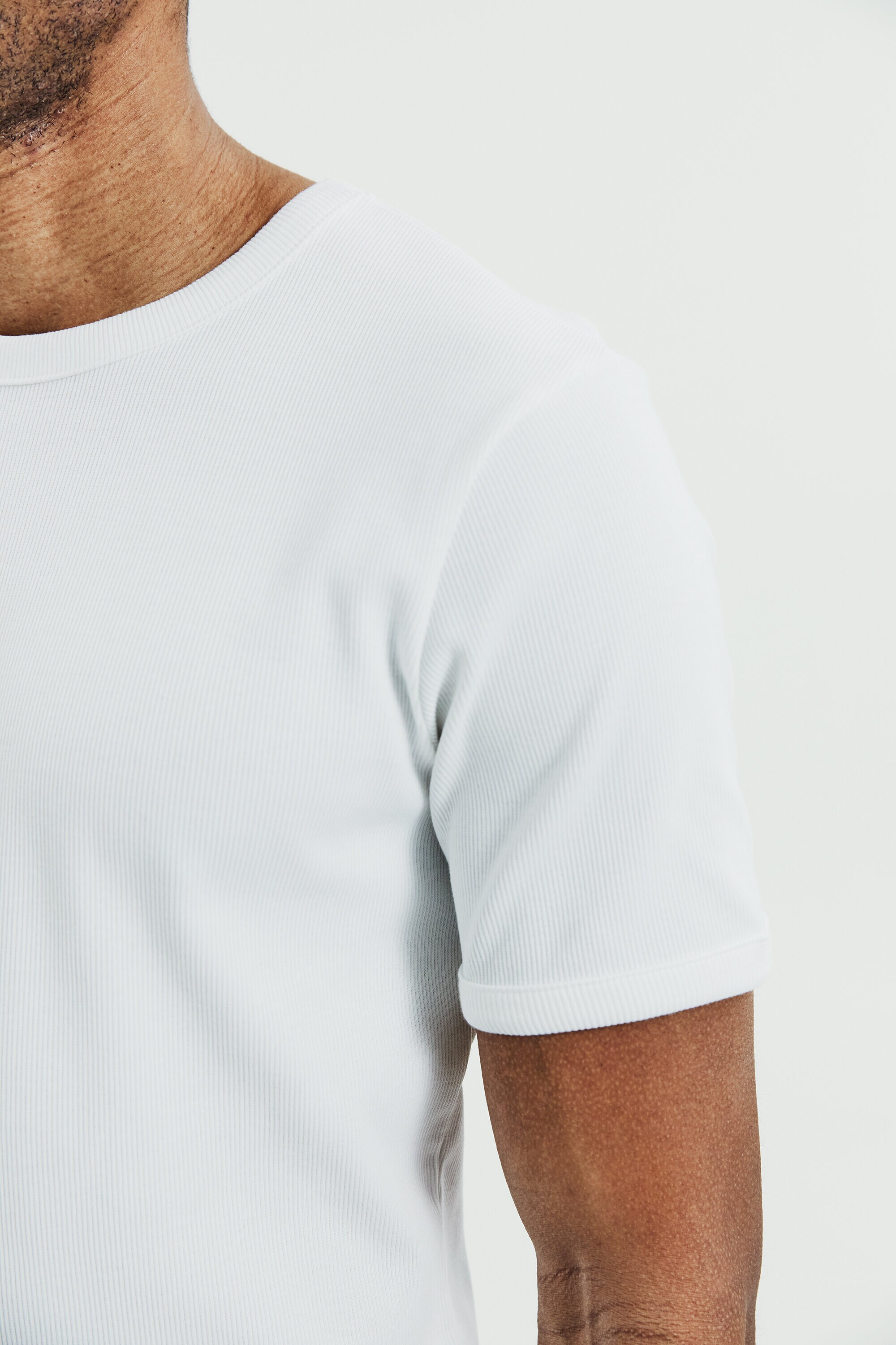 Ribbet T-shirt med rund hals til mænd. En moderne basis-T-shirt designet til hverdagsbrug. Den ribbede bomuldsstruktur giver en fleksibel og komfortabel pasform, der holder formen over tid.