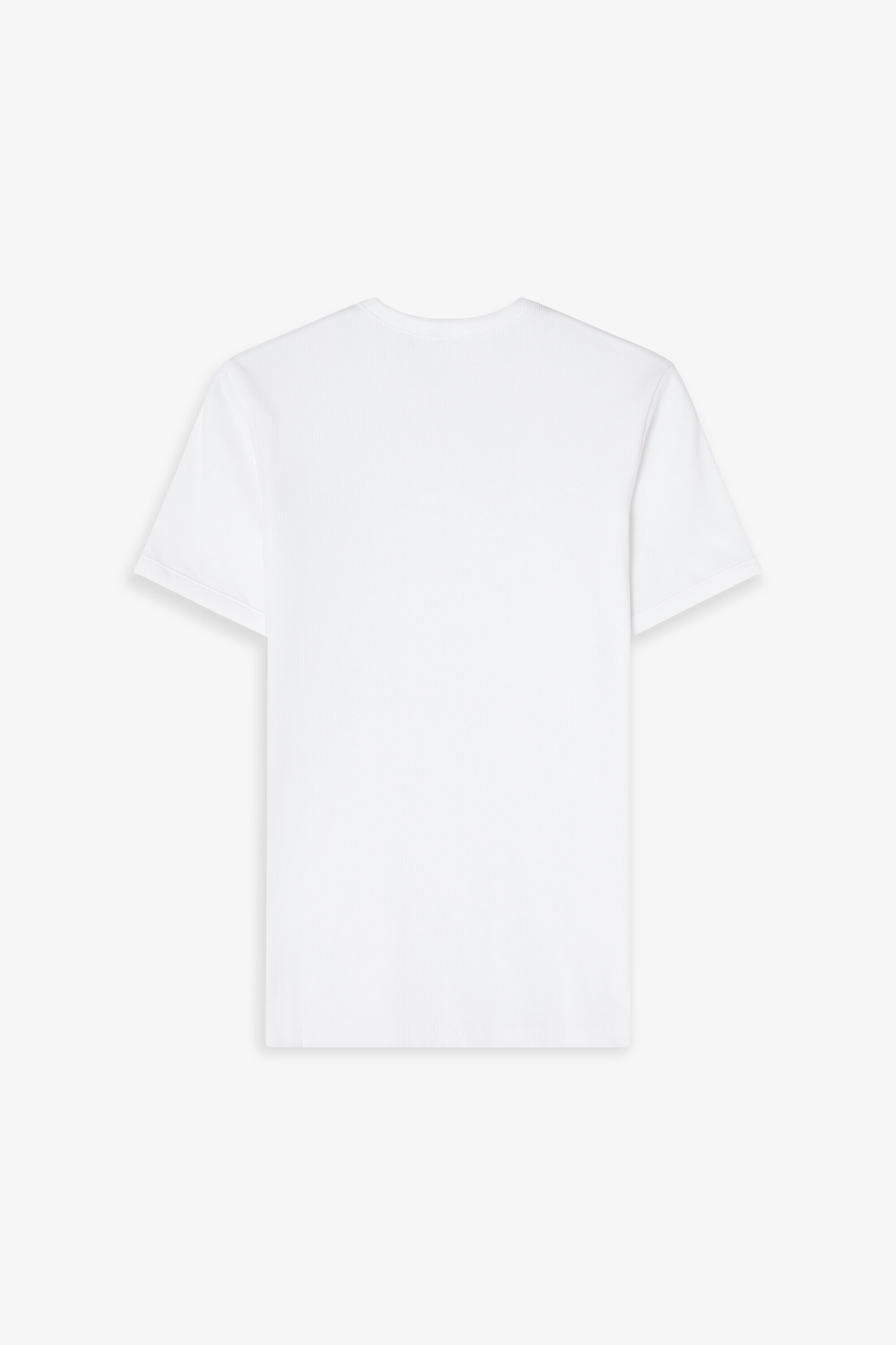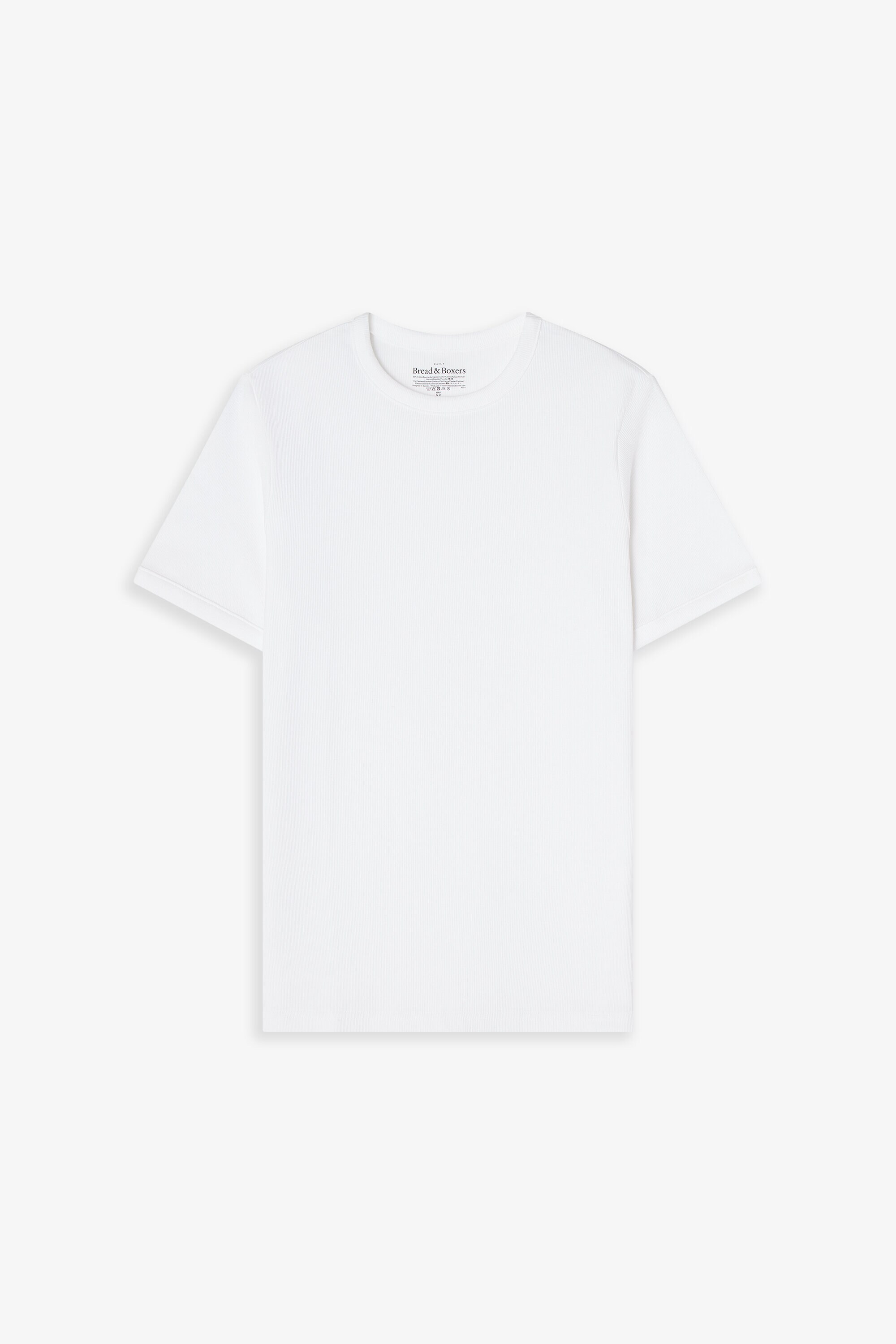 Den fine ribtekstur giver stoffet struktur, mens rene kantbånd ved ærmer og hals skaber et stilrent udtryk. Farven hvid gør T-shirten til et alsidigt basisplagg.