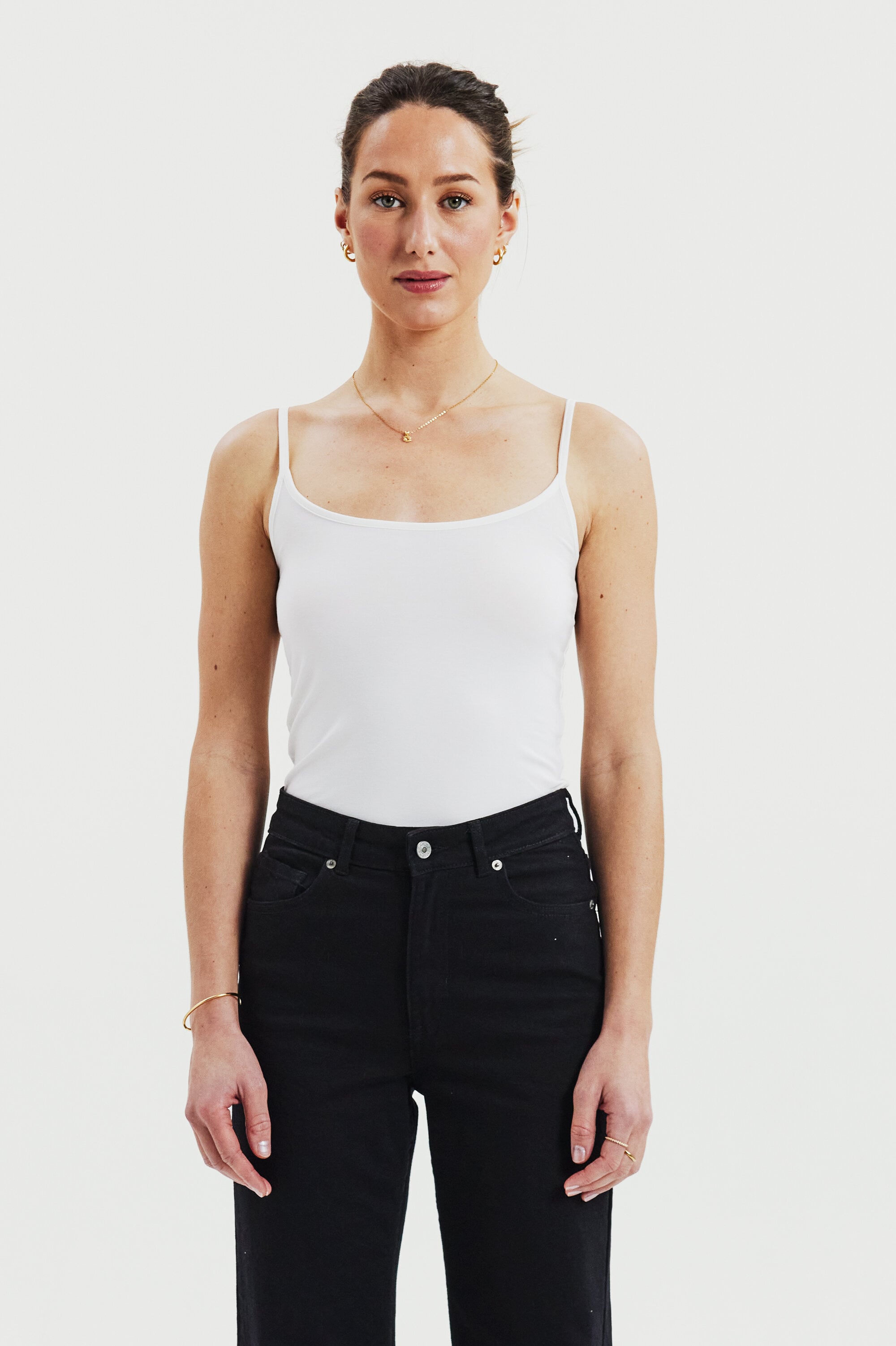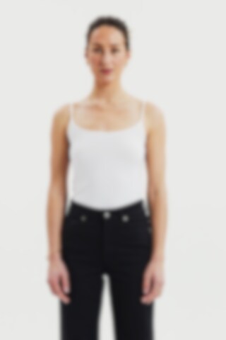 Tank top / singlet-top med smalle skulderstropper og rund halsudskæring. Fremstillet i blød lyocell med stretch, som giver en fleksibel og kropsnær pasform. Det lette og åndbare materiale gør toppen behagelig at have på hele dagen. En alsidig top til dame, perfekt som første lag under andre styles – eller alene på varme sommerdage.